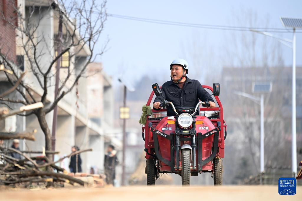 三輪車に乗って里峪湾村で高齢者に昼ご飯を届ける峪湾村の党支部書記の龐富強さん(2月6日に撮影)