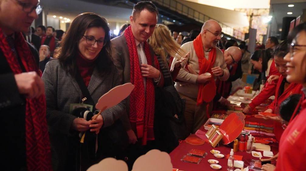写真は国連本部で開催の「駿啓新程」新春祝賀イベントにおいて、団扇のブースを見学する賓客(2月9日撮影)