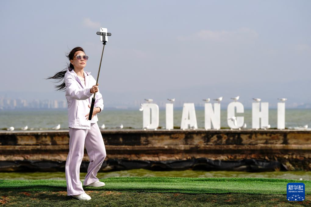 春の穏やかな陽射しの下、昆明の滇池が青く輝き、遠くの山並みが水墨画のように淡く霞み、ユリカモメが優雅に舞っている。訪れた人々は岸辺を散策したり、足を止めて写真を撮ったりしながら、生き生きと心温まる春の風景を彩る。