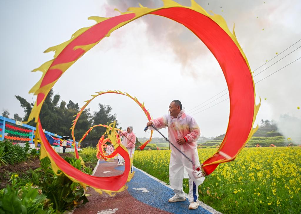 3日、菜の花畑でショーを披露するパフォーマー。(重慶=新華社記者/唐奕)