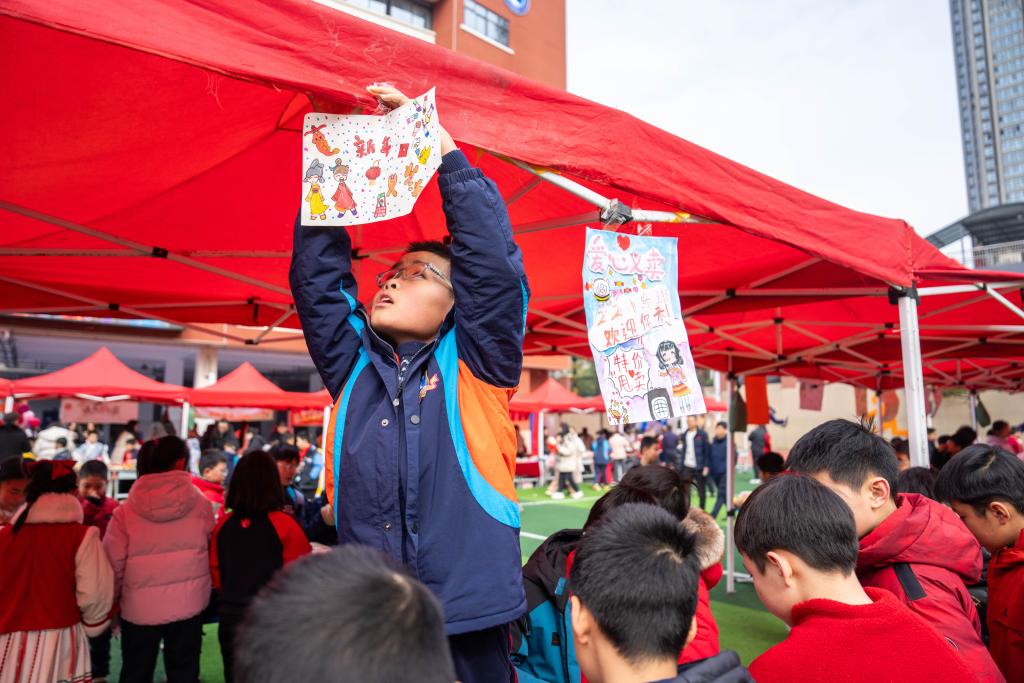 4日、チャリティーバザーの準備をする麓山国際実験小学校の児童。(長沙=新華社記者/陳思汗)
