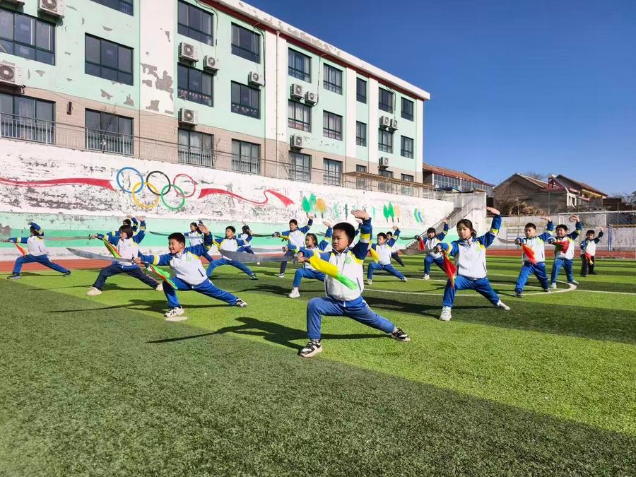 「九宮八卦斬穴拳」の練習をする朱家荘小学校の児童。(淄博=新華社配信)