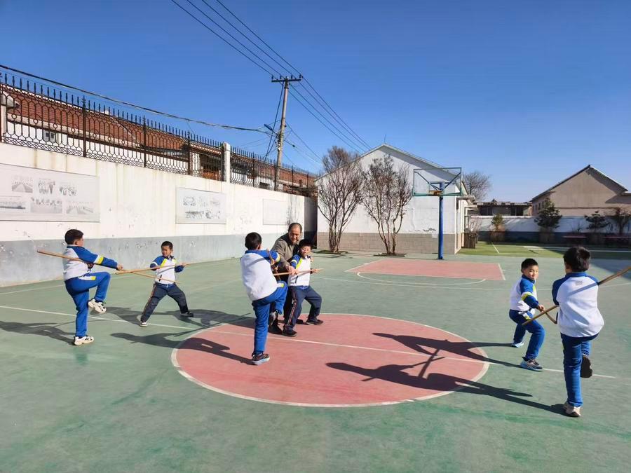 「九宮八卦斬穴拳」の練習をする朱家荘小学校の児童。(淄博=新華社配信)