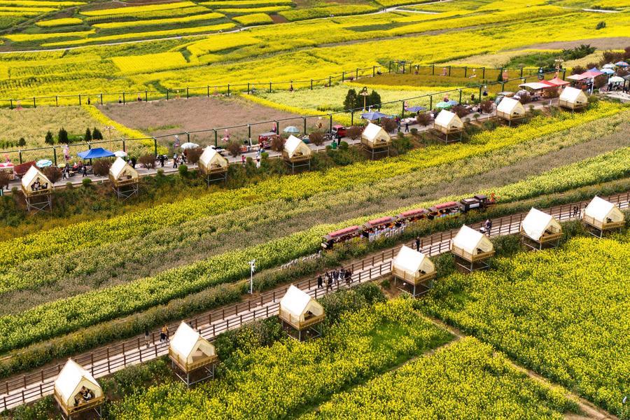 漢中市漢台区の黄塘水郷風景区に広がる菜の花畑。(ドローンから、漢中=新華社記者/鄒競一)