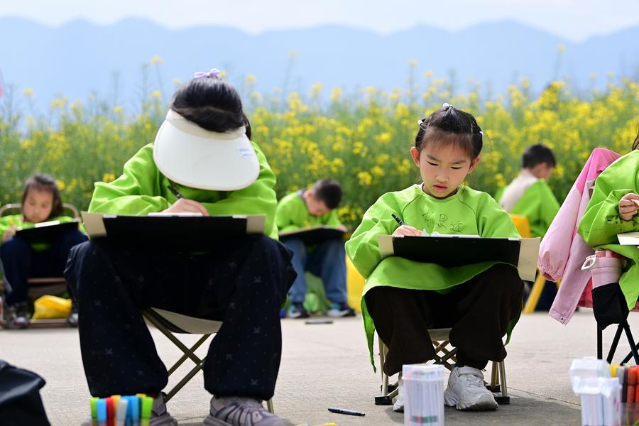 漢中市西郷県の菜の花畑で絵を描く子どもたち。(漢中=新華社記者/鄒競一)