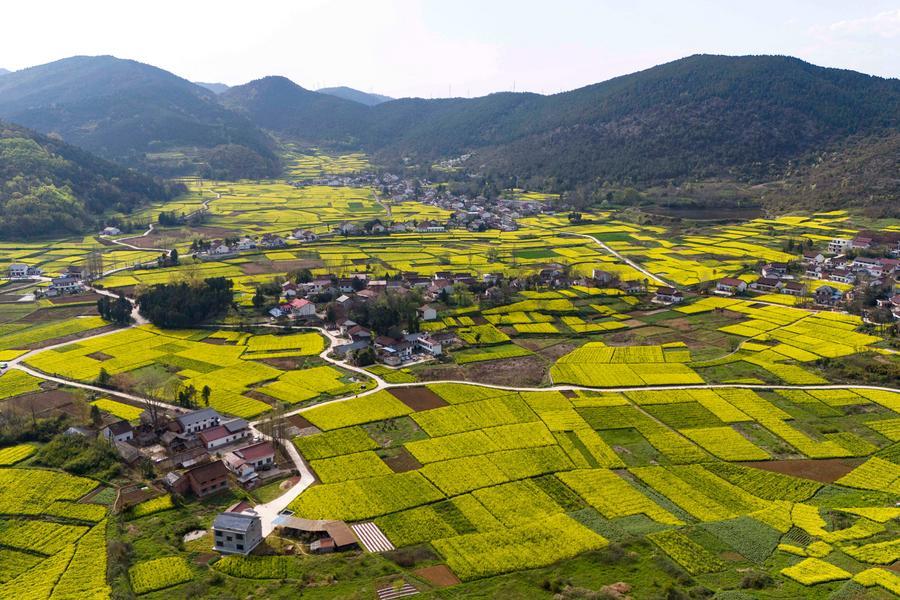 漢中市南鄭区に広がる菜の花畑。(ドローンから、漢中=新華社記者/鄒競一)