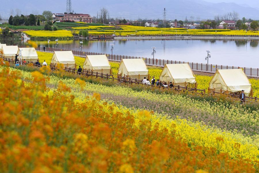 漢中市漢台区の黄塘水郷風景区を散策する観光客。(漢中=新華社記者/鄒競一)