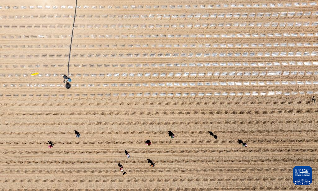 春の農繁期を迎えた寧夏回族自治区中衛市沙坡頭区香山のふもとに広がる荒れ地やゴビ砂漠では、面積数十万ムーに及ぶ地元特産のスイカ「硒砂瓜」の種まきがピークを迎えている。