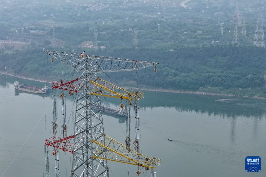 重慶市江津区珞璜鎮にある新玉500キロボルト送変電プロジェクト(送電線部分)の長江横断架線作業現場で11日午後、国網重慶電力の作業員が大型積載ドローンに四段投下装置を搭載し、導引ロープをけん引して長江横断に成功した。