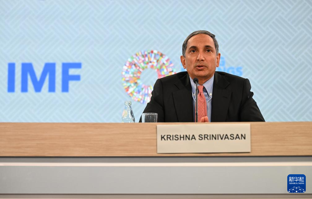 16日、米ワシントンで行われた会見で発言する、国際通貨基金(IMF)アジア太平洋局長のスリニバーサン氏。新華社記者 李睿撮影