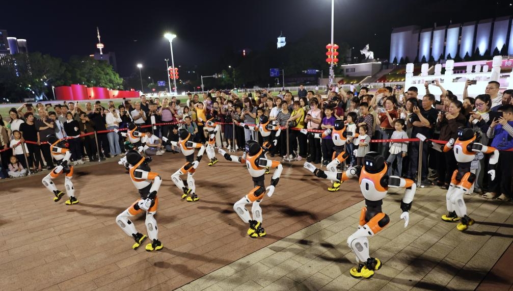 19日、福州五一広場でロボットのパフォーマンスを観覧する市民。