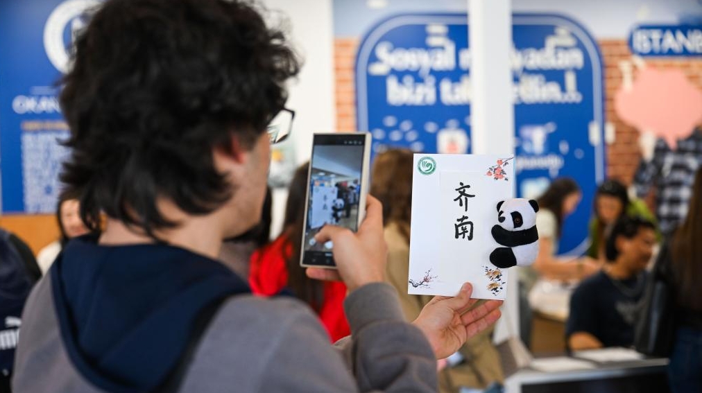 20日、トルコ・イスタンブールのオカン大学で、自分の中国語名を撮影する学生。