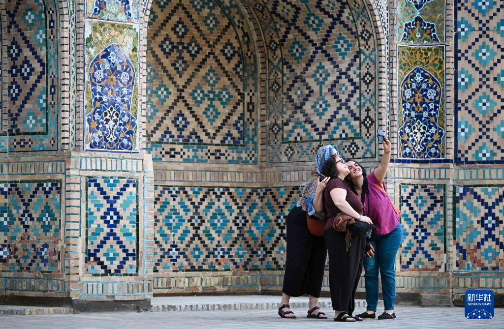 4月24日、ウズベキスタンのブハラ旧市街で自撮りをする観光客。新華社記者 李任滋撮影