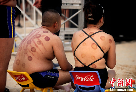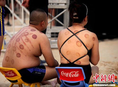 夏至を迎えた北京では、公園で遊ぶ若者の背中に残された鮮やかな「吸い玉」の跡が人目を引いていた。「吸い玉」は「火缶気」、「吸筒療法」とも呼ばれ、古くは「角法」とも言われた。