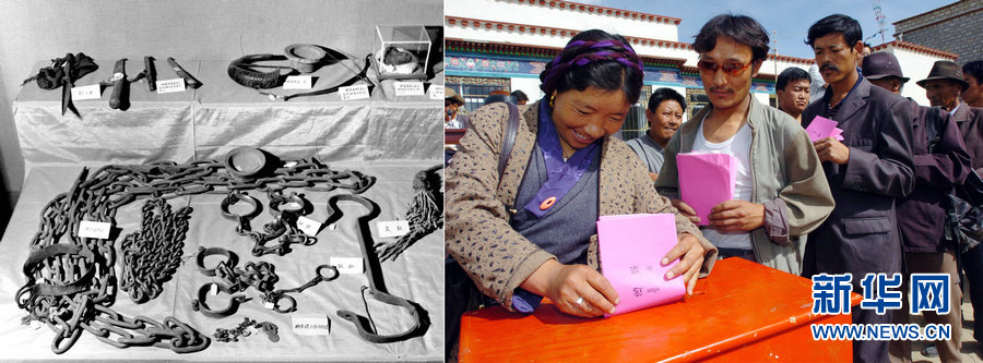 左は1959年10月、北京民族文化宮で展示された甘孜チベット族の農主が農奴を責めるため使った各種の刑具