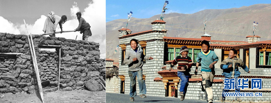 左は1961年、チベット自治区黒河県にある門堆卿で、家を建設している牧畜民のウキンさん。ウキンさんの家族はかつてテントで暮らしていた。 右はチベット自治区尼木県の尼木卿にある日措村で、完成した道で遊ぶ子供たち(2007年12月19日撮影) チベット自治区は2006年から、農民と遊牧民のために安定居住するプロジェクトを強力に進め、2007年までに50万人の遊牧民が新しい住宅に居住できるようになった。 |