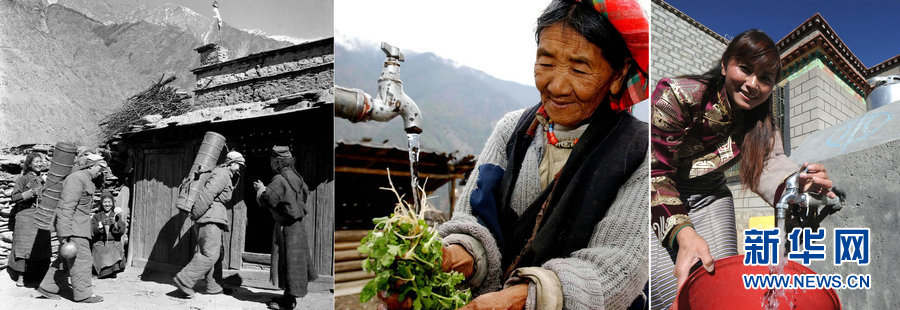 左は1962年に、隆子県に駐在した解放軍の戦士が現地のおばあちゃんに水を運ぶ。
