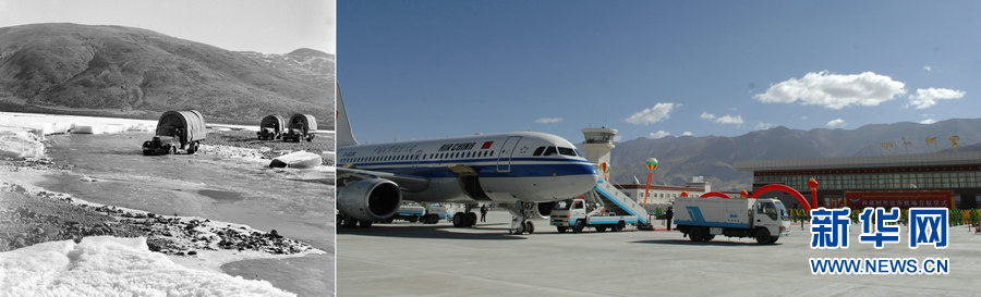左は、1961年各地からチベットの建設援助する物資を積んで、シガツェから阿里を結ぶ道路を走るチベット自治区運送局の「解放」ブランドの自動車。運送チームは阿里の噶尔昆沙に到着した後、氷河で橋もないため、氷を破って前に進んだ。 右は、中国国際航空会社エアバスのA319飛行機が阿里の昆莎空港で到着した。これはチベット自治区の阿里の昆莎空港が正式に通航したことを示す。昆莎空港がチベット自治区で建設された第4番目の民用空港だ。 |