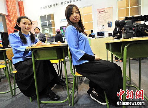 2012年北京教育設備展示会が20日、北京展覧館で開幕した。北京同歩科技公司の女性従業員が伝統的な女学生の学生服姿で、デジタル情報化教室の情報設備やテレビ会議式の教学設備を紹介して注目を集めた。 「人民網日本語版」2012年3月21日