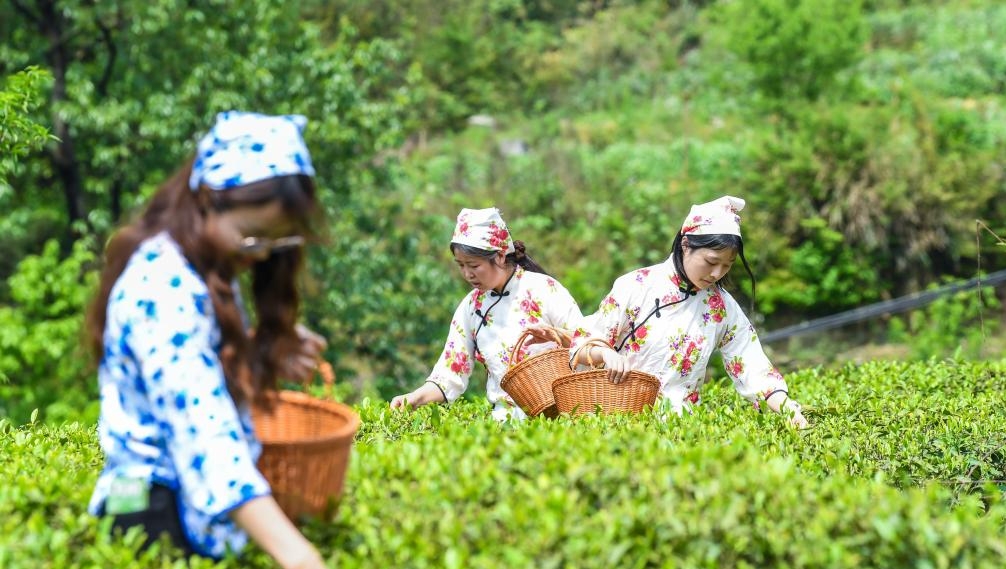 1万ムーの茶畑、摘み取り最盛期 浙江省安吉県