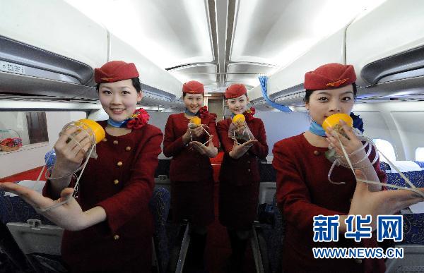 酸素マスクのつけ方を練習する学生たち