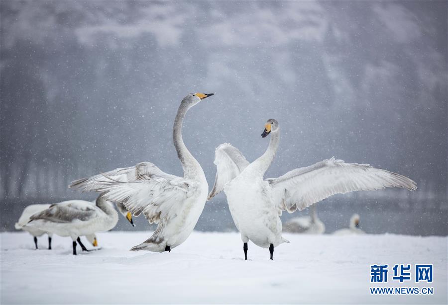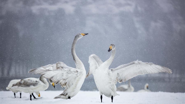 山西省平陸県の三湾黄河湿地で、雪が舞う中で羽を広げるハクチョウ