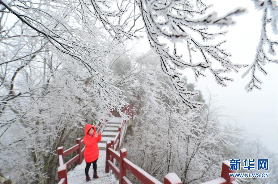 湖北省保康県馬橋鎮堯治河村の梨花山で樹氷を撮影する観光客