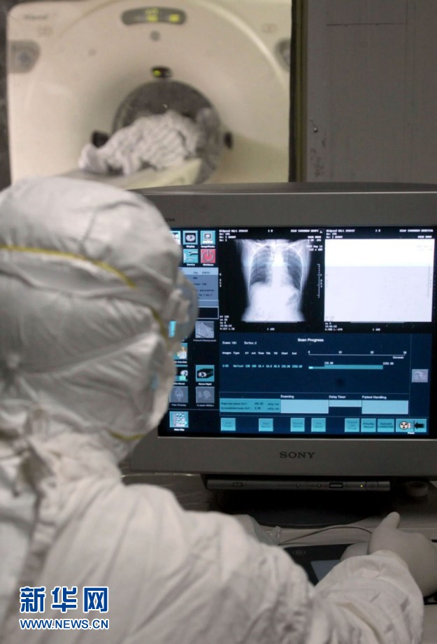 2003年5月14日:全軍のSARS救助・治療専門家指導グループ代表の金関甫氏が、北京小湯山SARS医院からまもなく退院する9人の回復患者のカルテと胸のレントゲンを見比べながら一人ひとり審査をしているところ。翌15日、この9人の患者は小湯山SARS医院から治癒して退院した最初のSARS患者となった。