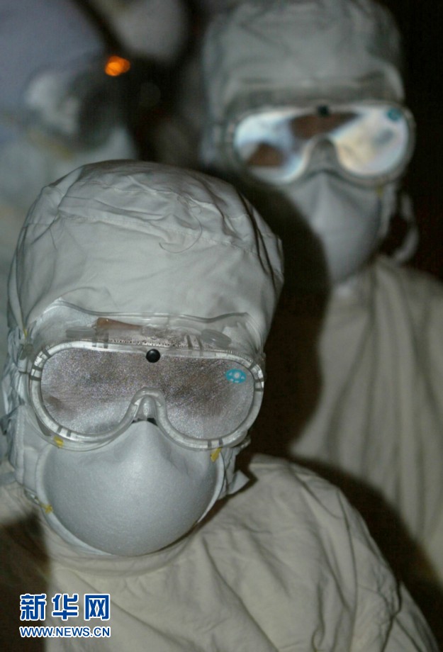 2003年5月19日:解放軍小湯山SARS医院の患者受入チームが、隔離エリアのゲートで最初の重症患者を迎えるところ。SARSの蔓延を抑えるため、解放軍総後勤部は命令に従い、軍全体の医療機構から1300人余りの医療スタッフを動員し、SARSとの戦いを展開した。