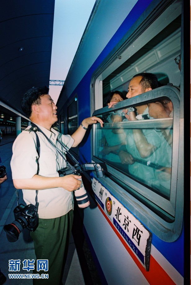 2003年6月23日:蘭州軍区に帰還する医療隊を北京西駅で見送る王建民。隔離エリア内で50日余りにわたって忙しく働いた若い軍人らの中には、北京にもう少しとどまりたいという人もいたが、命令に従い、一人残らず北京を離れて行った。