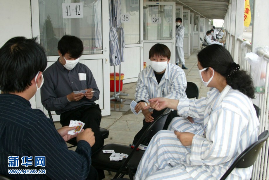 2003年5月14日:隔離エリアでトランプに興じるSARS患者ら。彼らの生活は希望の中で続いていた。