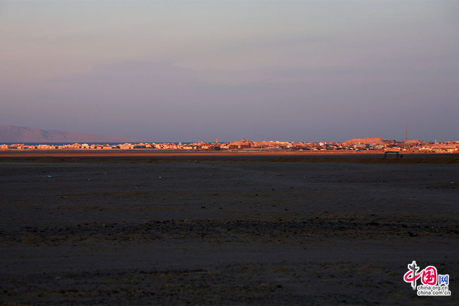 太陽が山の絶壁の間に沈み、バラ色とオレンジ色に変わった。筆者が再び振り返ると、赤い砂漠が輝きを失い、海の方に日が落ちていった。紅海と砂漠の中のオアシスは、夕陽の最後の余燼にひたり、温かく活力があふれていた。