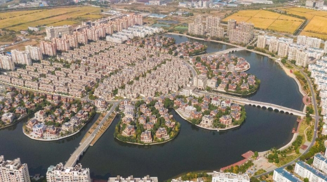 30日に空撮された江蘇省丹陽市界牌新村、湖沿いに建つ農家の集中居住区が大地に花開く。情報によると、敷地面積1500ムーの界牌新村は、マンション、一戸建て、コミュニティサービスセンター、幼稚園・小中学校、病院を一体化させている。現地住民の生活条件を大幅に改善した。