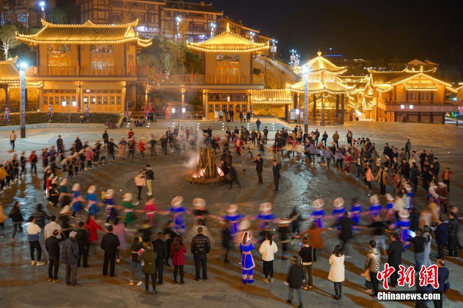貴州省晴隆県阿妹戚托小鎮は、三宝イ族郷の全住民を受け入れた新しい我が家だ。住民は移住後、夜の娯楽生活を充実させるため、阿妹戚托小鎮金門広場に集まり歌をうたいダンスをしている。移住後の新居における幸せな生活を満喫している。