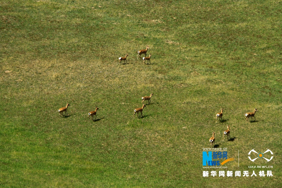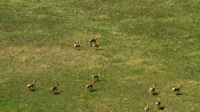 9月10日、牧草が茂った甘粛省の山丹馬場で走るプルジェワリスキーガゼルの群れ。プルジェワリスキーガゼルは「黄羊」とも呼ばれる国家一級保護動物で、かつて甘粛、青海、内蒙古、寧夏などの地域に広く分布していた。近年、生態環境の改善に伴い、山丹馬場に生息するプルジェワリスキーガゼルの数は増えている。