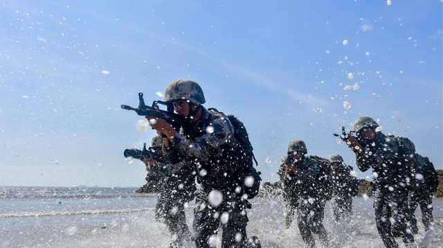 東部戦区陸軍第73集団軍某旅紅四連の兵士が、上陸作戦の訓練を行った(7月28日撮影)。