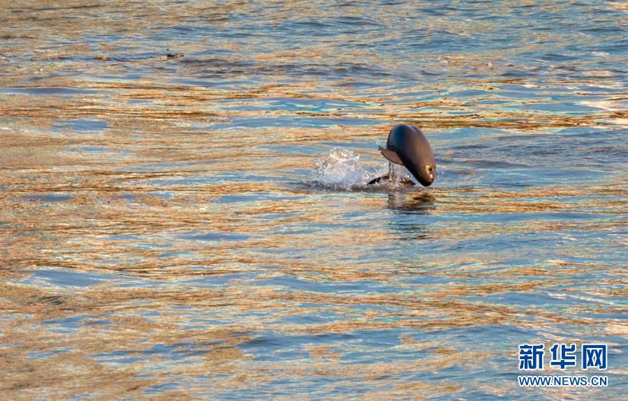 湖北省宜昌市西陵区の鎮江閣外で水遊びをするスナメリ
