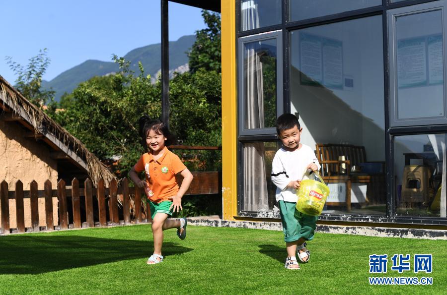 重慶市奉節県永楽鎮白龍村で遊ぶ子供(2020年7月27日)