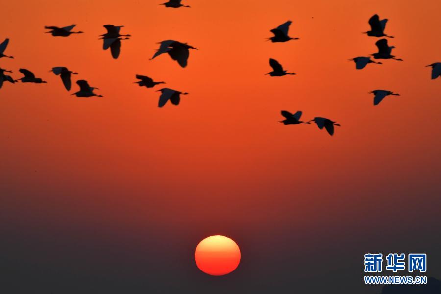 江西省の鄱陽湖畔にある「アオサギ村」(1月13日)
