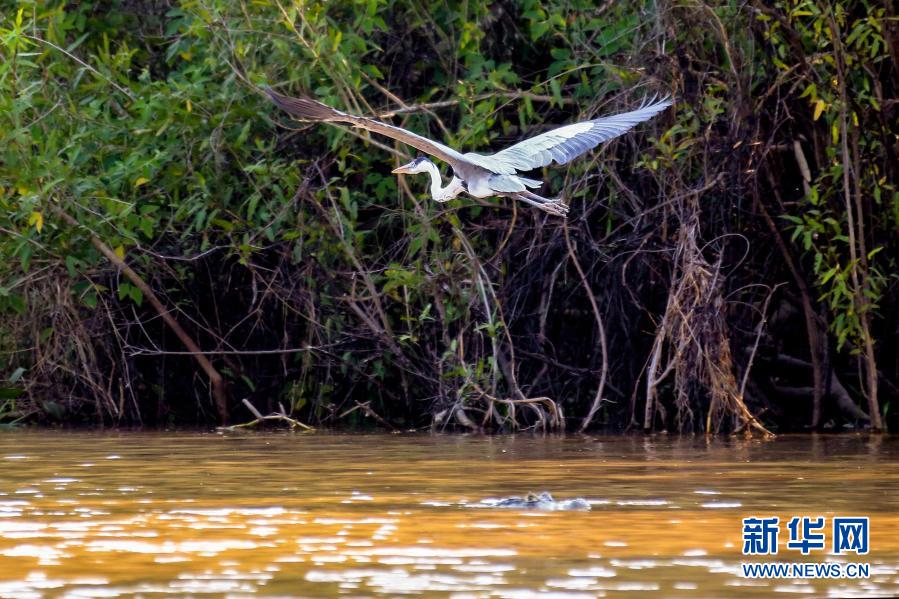南米大陸中部のパンタナル湿地で、鷺が水中に潜むワニの上を通過した(2015年12月5日撮影)。