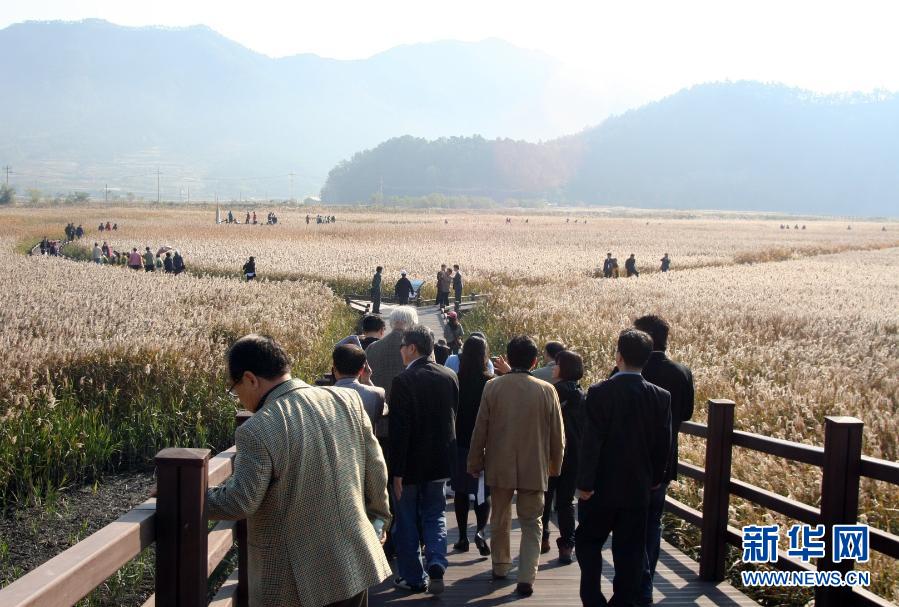 観光客が韓国・全羅南道の順天湾湿地の葦の中を散策した(2009年11月6日、新華社・何璐璐撮影)。