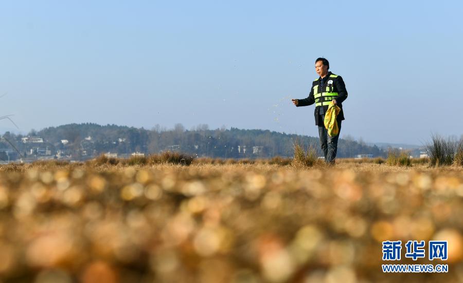 晩冬・早春の貴州省畢節市威寧イ族回族ミャオ族自治県の草海国家級自然保護区が再び、渡り鳥の越冬のピークを迎えた。高い所から遠くを眺めると、水域面積が25平方キロメートルを超える草海は波打ち、日差しを浴び輝いている。ここで越冬するオグロヅル、ナベヅル、インドガンなどの渡り鳥が群れをなし、水の上で追いかけ合い戯れ、低く空を舞い鳴き声を上げる。この美しい高原の湿地に活気をもたらす。