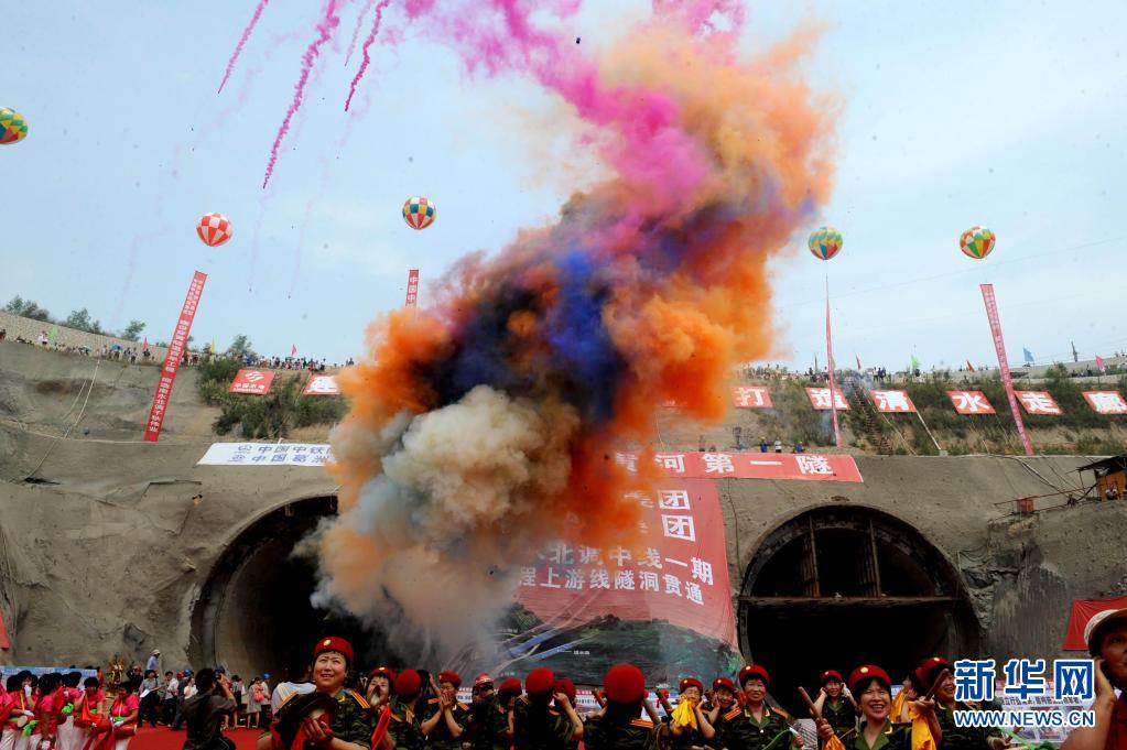 長さ4.25キロ、最大深度35メートルの2本の黄河横断トンネル内で最近、毎秒約280立方メートルの水が黄河を横断し、北岸の焦作温県のトンネル出口から出ている。この光景は「立体交差川」と形容されている。