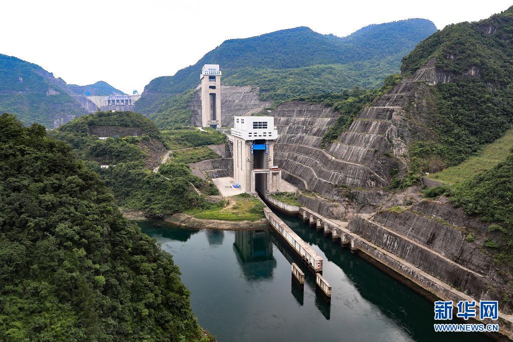 500トン級貨物船「航電1号」が22日、烏江構皮灘水力発電所の航行プロジェクト内で試験運行した(ドローンで撮影)。貴州省遵義市余慶県内の烏江構皮灘水力発電所航行プロジェクトが同日、試験運行を開始した。同プロジェクトの全長は2306メートルで、川上・川下の入港路、3段階の垂直シップリフト、2段階の中間水路が含まれる。試験運行開始後、500トン級船舶は貴陽の開陽埠頭から構皮灘、思林、沙沱、彭水を通過し、重慶市涪陵区から長江に入れるようになる。