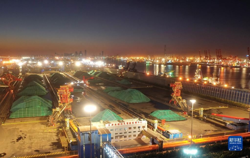 天津港石炭埠頭は夜でも昼のように明るく、全長17キロの石炭輸送ベルトコンベアが稼働を続けていた。発電用石炭を運ぶ船が埠頭に停泊し、船積み作業を行っていた。中国の多くの石炭火力発電の石炭中継輸送拠点である天津港石炭埠頭は、発電用石炭の輸送に積極的に取り組んでいる。