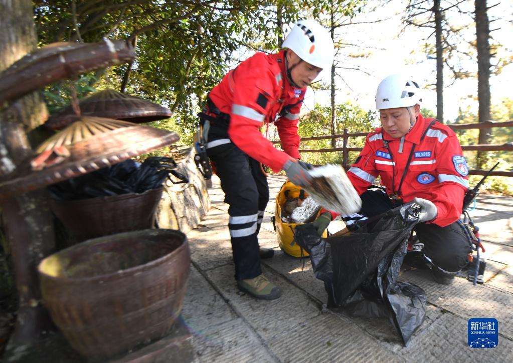 湖南省張家界市武陵源山地緊急救助隊は同日、黄石寨の断崖絶壁で緊急救助ロープ降下訓練を実施すると同時に、ビニール袋やペットボトルなどのゴミを拾い、武陵源世界自然遺産を大切にするよう観光客に呼びかけた。同緊急救助隊は現地の山地緊急救助及び屋外スポーツなどを中心とする公益性組織で、隊員は毎年定期的に風景名勝区の崖でゴミを拾っている。