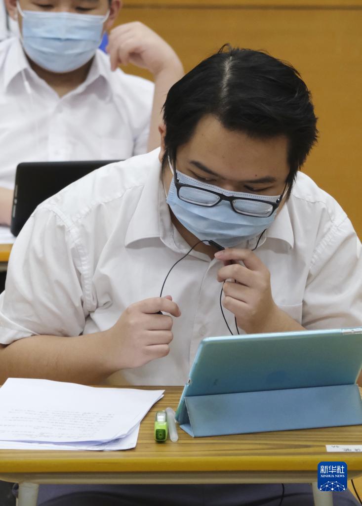 香港則仁学校のホールで、20数人の生徒がイヤホンとタブレットPCを使い、ディスプレイの向こうにいる深セン光祖中学校の生徒と共に学んだ。