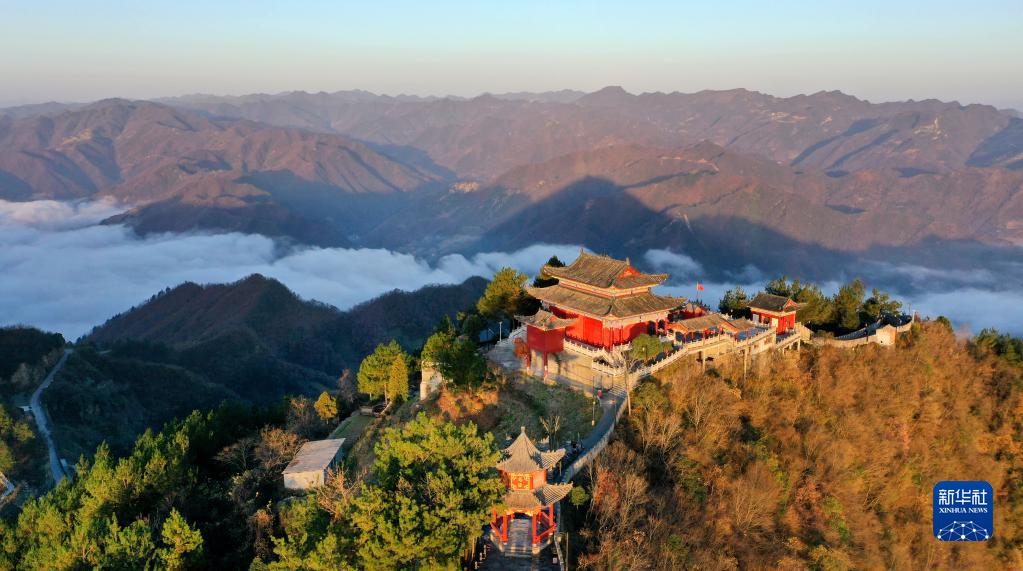 廟山寨の主峰が23日、朝もやに包まれた(ドローンで撮影)。