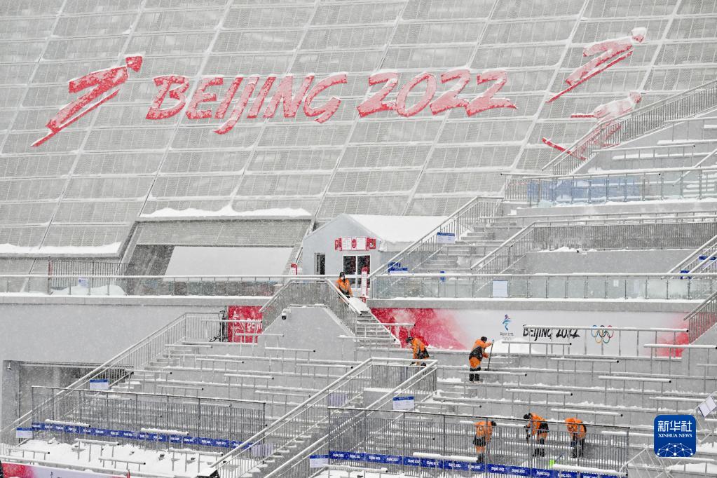 2月13日、北京2022年冬季オリンピック張家口競技区で雪が降った。国家スキージャンプセンターの技術士と従業員は同日の公式トレーニングに備え、緊急で除雪とコース整備作業を行った。