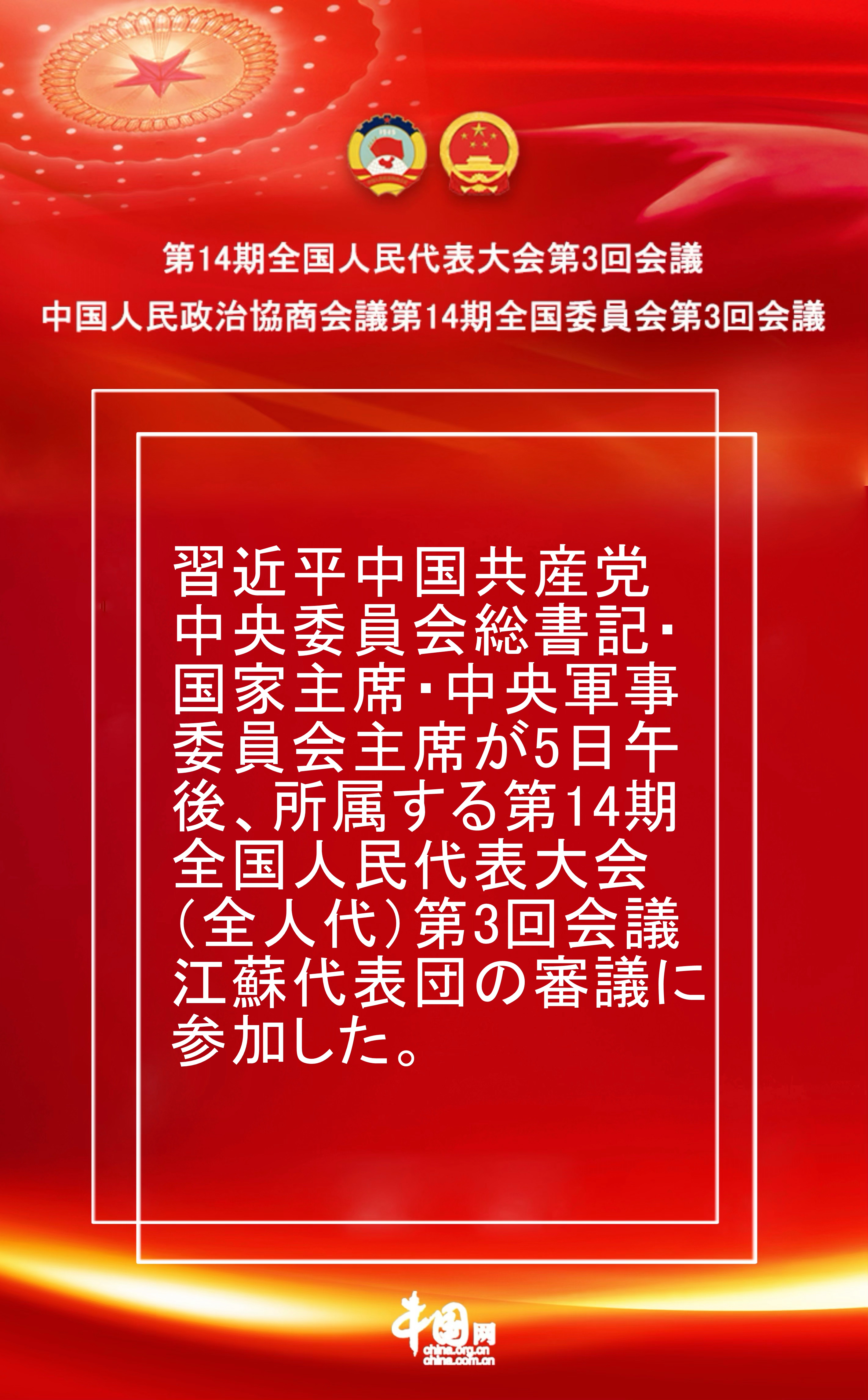 習近平中国共産党中央委員会総書記・国家主席・中央軍事委員会主席が5日午後、所属する第14期全国人民代表大会(全人代)第3回会議江蘇代表団の審議に参加した。